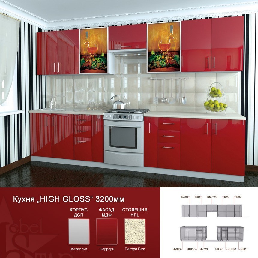 Модульная кухня фабрики Mebel Star "High Gloss" - это кухня, в стиле хай-тек. Очень большой выбор стандартных кухонных ящиков, изготовление ящиков не стандартных размеров а также выбор не стандартных цветов фасадов.